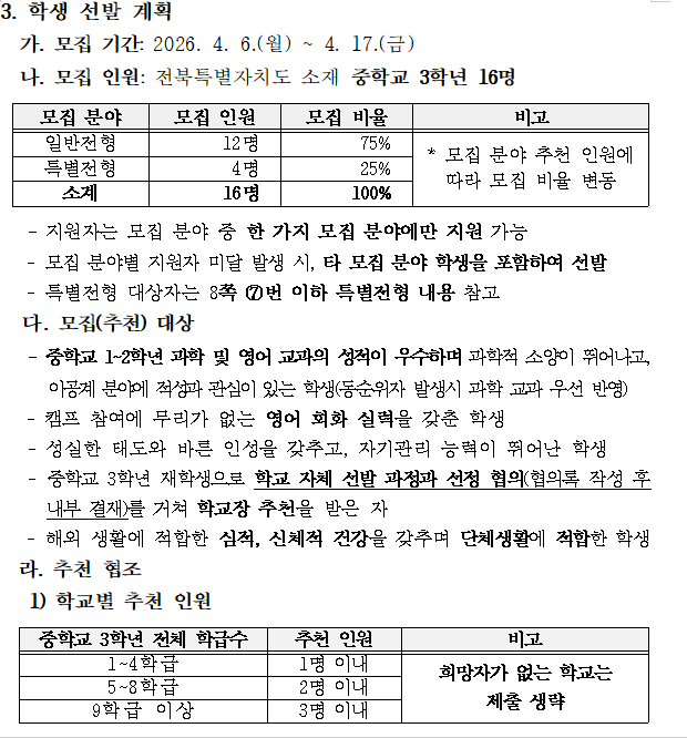 매해 전부 교육청에서 NASA 글로벌 캠프 선발해서 연수를 보내왔어요 올해 2026 년도에도 학생들을 선발하네요 일단 중3 학생을 선발 대상으로 하네요 모집 기간: 4월 6일부터 17일까지 아마 학교별로 차이가 있지만 학교 내부 선발 과정을 위해서 4월 6일까지 지원을 해야 할 것 같아요 저희 아이들이 23 24 25 매해 NASA 캠프에 합격하여 다녀왔어요 23년 24년 25년 매해 캠프를 다녀온 아이들은 영어면접 한국어 면접을 위해 준비하는 과정부터 미국에 도착 후 NASA 센터에서 생활 등이 너무 가치 있는 시간이었다고 하네요 매해 전북학생들의 빛나는 미래를 위해 NASA 글로벌 캠프를 준비해 주신 교육청 관계자분들께 감사드립니다 공부 마음....... <img src="https://blogthumb.pstatic.net/MjAyNjAzMzBfMTUy/MDAxNzc0ODM0MjEyMzUz.TgevdCCyOqS3QWKt3hWEXMwPtWMFhwMBzlF81XjhJx8g.tpVLWK8F-fxxY942N5xJTKbpPSxrOCtJGv5Ha9c9adQg.PNG/26_%B3%AA%BB%E7_%B8%F0%C1%FD_%BC%B1%B9%DF_%B0%E8%C8%B9.png?type=s3" />