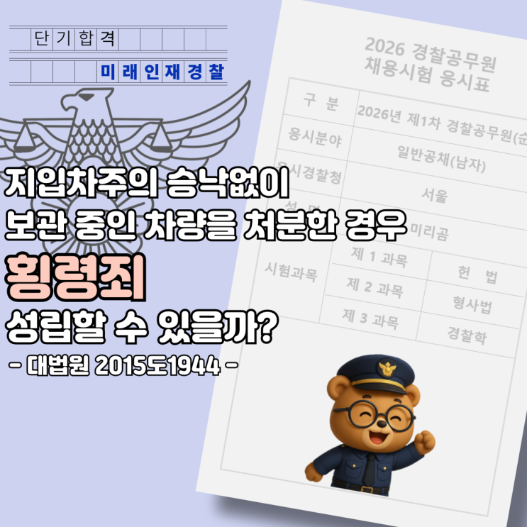 안녕하세요, 미래인재 경찰학원입니다. 형법은 조문만 보면 딱딱하지만, 판례를 통해 보면 훨씬 입체적으로 이해할 수 있는 과목이죠. 공부하시는 분들뿐만 아니라 형법이 궁금한 분들께도 도움이 되었으면 합니다. 그럼 오늘의 형법 판례, 함께 살펴보겠습니다. 승낙 없이 보관 중인 차량을 사실상 처분한 경우, 횡령죄가 성립할 수 있을까요? 대법원 2015도1944전합 판례를 통해 알아보도록 하겠습니다. 1️⃣ 사건의 배경 이 사건의 중심에는 차량이 있었습니다. 그런데 이 차량들, ✔️ 등록명의자는 지입회사 ✔️ 실제 운행·관리는 지입차주 ✔️ 그 차량을 보관만 하던 사람도 있었습니다. 문제는 이 차량들이 차량 소유자의 승낙 없....... <img src="https://blogthumb.pstatic.net/MjAyNjAxMjFfMTkx/MDAxNzY4OTY4MjE5MDc2.N8LXB223fjc_BL95TP4oZWOqWjl6gObwIoSQ754ETG4g.d2p7HWCdjH3owycdN_DtGI1zlkgQk4vTCkj-I0wHKP4g.PNG/001.png?type=s3" />