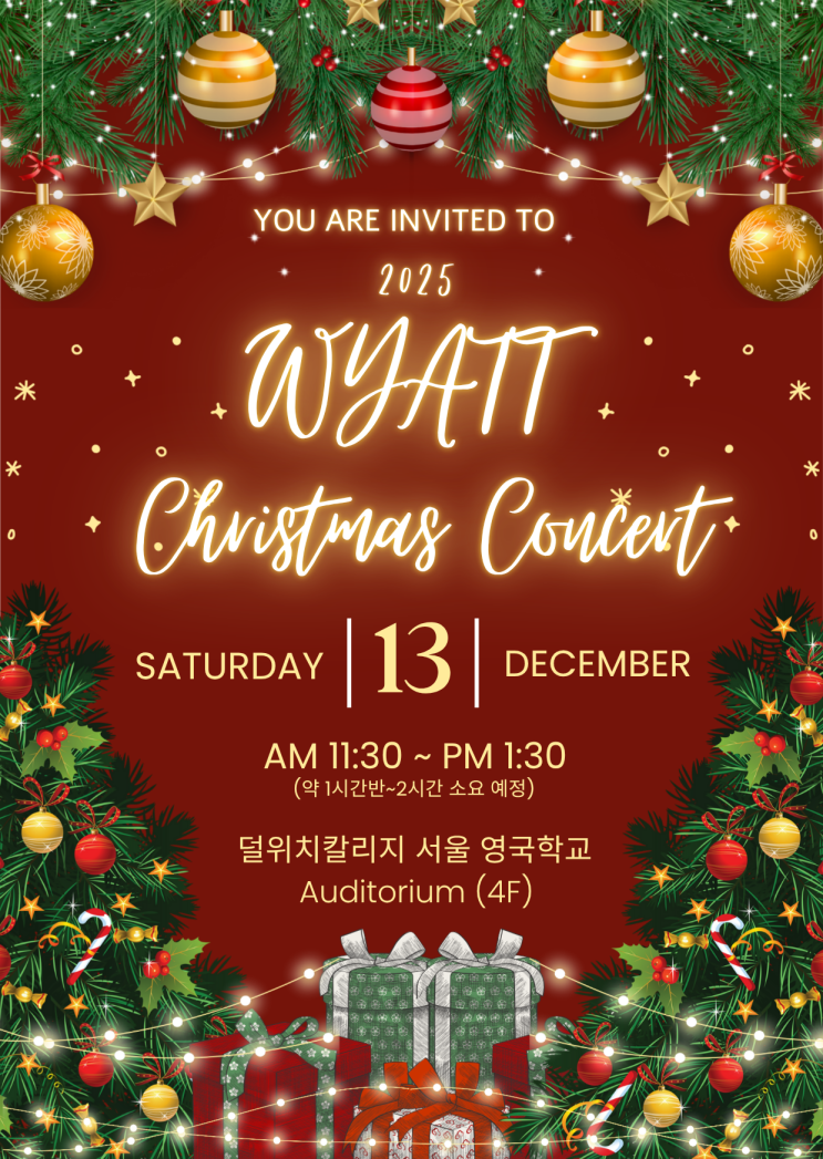 안녕하세요 :) 프리미엄 유아 영어 독서토론 전문학원 와이어트 입니다. 크리스마스가 얼마 안남았네요~2025년도 얼마 남지 않았습니다. 연말 마무리는 잘 되어 가고 계신가요?^^ 보통 유아기관에서 연말이 되면 아이들 '재롱잔지' 나 '발표회' 를 진행하죠~ 와이어트도 매년 연말이 되면 와이어트 가족분들을 모시고 아이들과 열심히 준비한 공연을 선보인답니다~ 하.지.만!! 와이어트의 크리스마스 콘서트는 단순한 발표회가 아니랍니다~ “영어학원에서 크리스마스 콘서트 한다고 해서 그냥 노래 몇 곡 부르는 행사겠지?” "아이들 재롱잔치 뭐 항상 보는 그런 거겠지~?" 만약 그렇게 생각하셨다면,,,, 와이어....... <img src="https://blogthumb.pstatic.net/MjAyNTEyMjJfMjMw/MDAxNzY2MzcyMzQ1NTUx.mHLpoVED-hEyBqW13HHP2pYJ_ObOmc5QNRWtvittleIg.RuZ-Z56No8g8K6NpggtFZGmzH95VAoRq8waHbUz4DZQg.PNG/Red_and_White_Modern_Christmas_Party_Invitation_%281%29_%281%29.png?type=s3" />