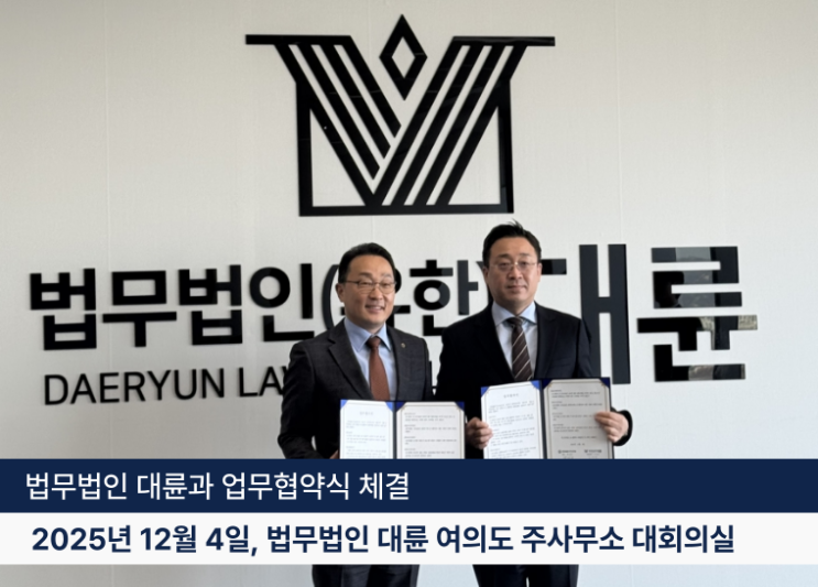 지난 2025년 12월 4일, 국내 10대 로펌 법무법인 대륜의 요청으로 업무 협약식을 체결했습니다. <img src="https://blogthumb.pstatic.net/MjAyNTEyMjJfODAg/MDAxNzY2MzkwNTI2NTE4.QCpX5Ba9kPDAtc6Gq_qCMMTmAaXacjFsNQSuHQX1UeMg.5W320ILpYQcPPl63vllKqxBZ00JhspedtFE6SyH2bj8g.PNG/010.png?type=s3" />