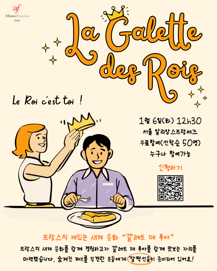 프랑스의 재밌는 새해 문화 ”갈레트 데 루아(Galette des rois)“ 서울 알리앙스프랑세즈에서 경험해 보세요! 프랑스에서는 매년 1월 6일 주현절에 갈레트 데 루아(Galette des rois)라는 디저트를 먹는데요, 갈레트 속에 숨어있는 페브(fève)라는 도자기 인형을 뽑은 사람이 왕관을 쓰고 그날의 왕이 된답니다! 프랑스의 새해 문화를 수강생 분들과 함께 경험하고자 함께 갈레트 데 루아를 맛보는 자리를 마련했습니다. 숨겨진 페브를 발견한 분들에겐 *깜짝선물*이 준비되어 있으니 많이 많이 참여해 주세요! [행사일정] ▶일시 : 1월6일(화) 12h30 ▶장소 : 서울 알리앙스프랑세즈 카페테리아 ▶대상 : 누구나 참여가능(선착순 50명) ▶....... <img src="https://blogthumb.pstatic.net/MjAyNTEyMjRfMTc5/MDAxNzY2NTQ3OTMxMTU0.zwcFC8JfjaTNK911ytg59BSFOUapjvu0XM-3OMlAiG4g.gxQqtZFJA0C9HSwU9vb35_b2ArOzERvqx6e9S-vssBcg.PNG/KakaoTalk_20251224_115708547.png?type=s3" />