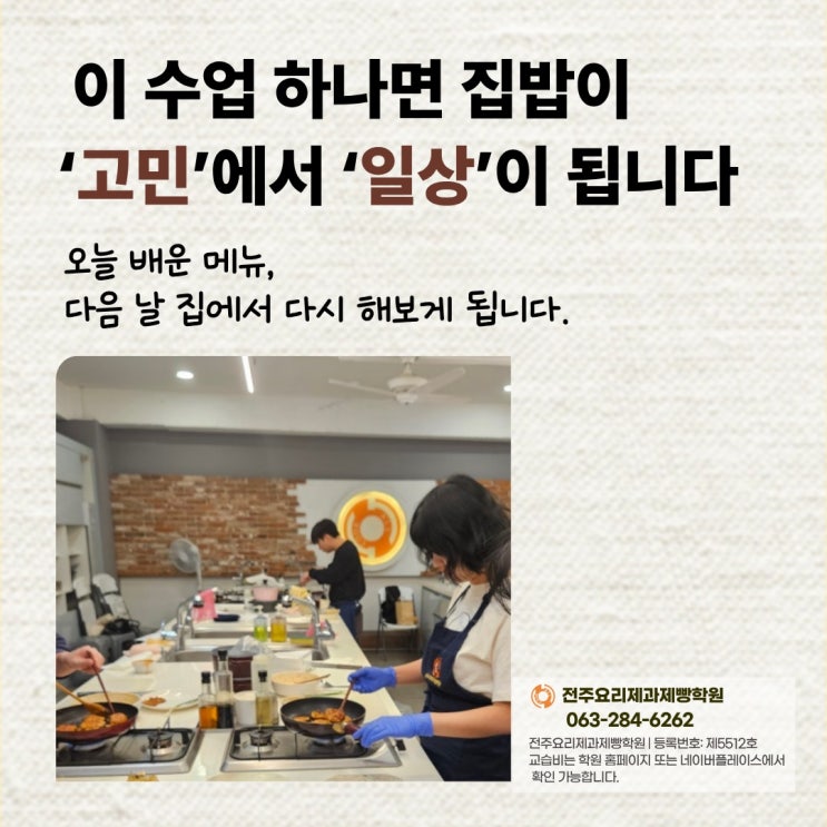 집에서 밥을 해먹고 싶지만 막상 시작하려면 메뉴부터 막막한 분들 많으시죠. 이번 건강한 한식 집밥 요리과정은 ‘집밥을 꾸준히 해먹을 수 있는 힘’을 기르는 데 초점을 맞춘 실습 중심 수업입니다. 이 과정에서는 ✔ 집밥에 꼭 필요한 한식 기본 조리법 ✔ 일상에서 바로 활용 가능한 메뉴 구성 ✔ 혼자서도 재현 가능한 실습 방식 을 통해 집밥에 대한 부담을 줄여드립니다. 요리가 처음이신 분, 한식이 늘 어렵게 느껴졌던 분, 외식과 배달을 조금씩 줄이고 싶은 분께 특히 추천드려요. 평일 오후 2시, 차분하게 배우는 집밥 수업으로 일상의 식탁을 바꿔보세요. - 26.01.08 ~ 26.01.22 - 오후 14:00 / 목·금 - 전주요리제과제빵학원 ☎ 06....... <img src="https://blogthumb.pstatic.net/MjAyNTEyMjRfNDkg/MDAxNzY2NTYxMzU0Nzgz.sES0f_a6cAXmMjkkPdWNHyDwUlqYZWCpI-srKWzIq_8g.41OaVy41DopdFeRjmMnsFOXvDIObeWnm8vtQYmEwkzAg.JPEG/%C1%A6%B8%F1%C0%BB_%C0%D4%B7%C2%C7%D8%C1%D6%BC%BC%BF%E4._%2814%29.jpg?type=s3" />