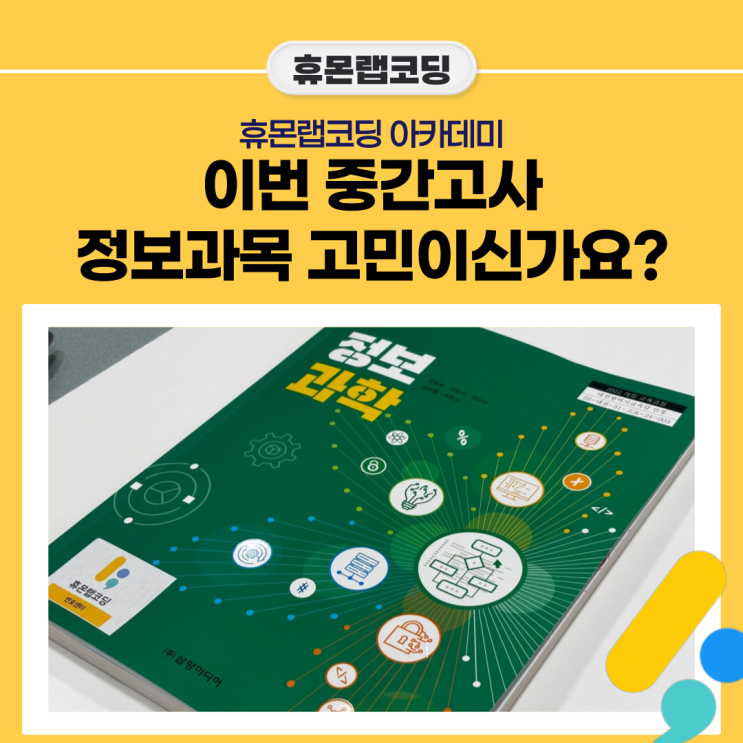 안녕하세요! 스스로 생각하는 힘을 키우는 휴몬랩코딩 아카데미 입니다. 안녕하세요, 휴몬랩코딩 아카데미입니다. 학교에서 정보 교과가 생겨난 이후로 이러한 이야기가 있을 겁니다. '정보내신? 어떻게 준비해야하 하지?' '정보내신도 중요한걸까?' 많은 학생들이 정보내신을 단순히 암기 과목으로 착각하거나, 실습만 하면 된다고 생각하곤 합니다. 겉으로 보기에는 쉬워 보여도 막상 배워보면 깊이 있는 이해력과 문제 해결 능력을 요구하는 것이 바로 정보내신입니다. 이번 중간고사에는 고민없이 어떻게 정보내신을 준비하는 것이 좋을지 알아보도록 하겠습니다. 정보내신, 암기만으로 충분할까? 보통 학교 현장에서 진....... <img src="https://blogthumb.pstatic.net/MjAyNjAzMjNfMjY4/MDAxNzc0MjQyNTU2MTA0.p_Sc4JqbVhl28XLwocQJ_LY_o5RoJxR_19pHm2DjM8Ig.336cL-xPCoAnSuYZFSb6SWH_Um9ACqxuKIgGAhtn5-kg.PNG/%BA%ED%B7%CE%B1%D7-2-002.png?type=s3" />