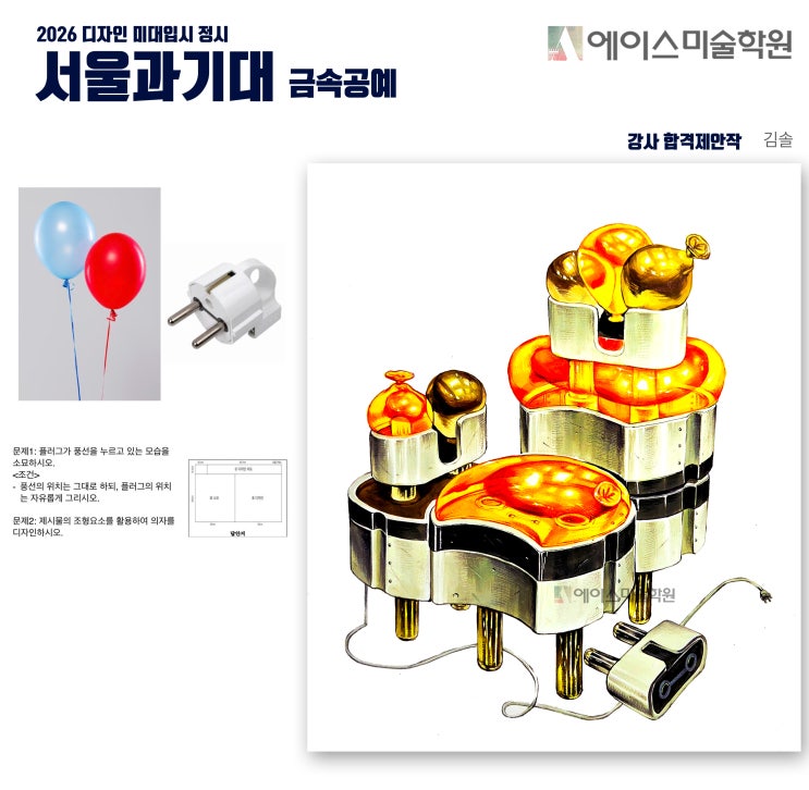2026 디자인미대입시 정시 서울과기대 금속공예 기출문제 문제1: 플러그가 풍선을 누르고 있는 모습을 소묘하시오. <조건> 풍선의 위치는 그대로 하되, 플러그의 위치는 자유롭게 그리시오. 문제2: 제시물의 조형요소를 활용하여 의자를 디자인하시오. 문제 풀이 해석 플러그와 풍선을 소재로 의자를 디자인하는 문제입니다. 서로 거리가 먼 소재들이지만, 의자의 구성요소와 기능을 소재의 형상이나 기능에 연관지어 해석하면 생각보다 간단한 문제입니다. 풍선의 촉감이나 쿠션감을 고려하자면 이는 의자의 앉는 부분에 연관지어지고, 플러그의 구조감이나 금속의 견고한 이미지 들을 생각하면 기본적인 골격의 구조는 플러그를 바탕으로....... <img src="https://blogthumb.pstatic.net/MjAyNjAzMjhfMzAg/MDAxNzc0Njc1NTc3NDIw.7jV-Jp2ktLQQIEWqtQOoPG3FvRsmn_8WurFH53B-Rywg.cRiGU1N9-Wqv9hz9jRRHeiiIf623szRhapA4AXd9VEgg.JPEG/%BC%AD%BF%EF%B0%FA%B1%E2%B4%EB_%B1%DD%BC%D3%B0%F8%BF%B9.jpg?type=s3" />