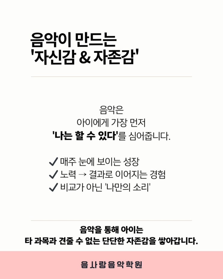⠀ 신학기를 앞둔 2월은 아이에게도, 부모에게도 참 복잡한 시기입니다. 새로운 친구, 새로운 교실, 새로운 규칙. 아이의 마음속에는 설렘과 함께 작은 긴장과 불안이 공존합니다. 이 시기에 음악교육을 시작하는 것은 '무언가를 더 시키기 위함'이 아니라 ✅️ 아이의 마음과 태도를 준비시키는 선택입니다. 1️⃣ 음악은 아이에게 가장 먼저 자신감을 만들어줍니다. 연습한 만큼 결과가 나타나고, 조금씩 나아지는 자신의 모습을 스스로 확인할 수 있기 때문입니다. 이 경험은 아이에게 "나는 해낼 수 있다"는 감각을 자연스럽게 심어줍니다. 2️⃣ 음악이 주는 자존감은 타 과목과 견줄 수 없는 깊이를 가집니다. 정답이....... <img src="https://blogthumb.pstatic.net/MjAyNjAxMTlfMjIg/MDAxNzY4ODI4MjMyNTc0.VDF91GPe3DMYmTFreNNtA8Tosd9LzJ-aaHC_JZUisz4g.N6NmMikkHrTHxWFv18D1XvAJc6TqK0ezC8FiTPM2Ecgg.JPEG/IMG%A3%DF2202.JPG?type=s3" />