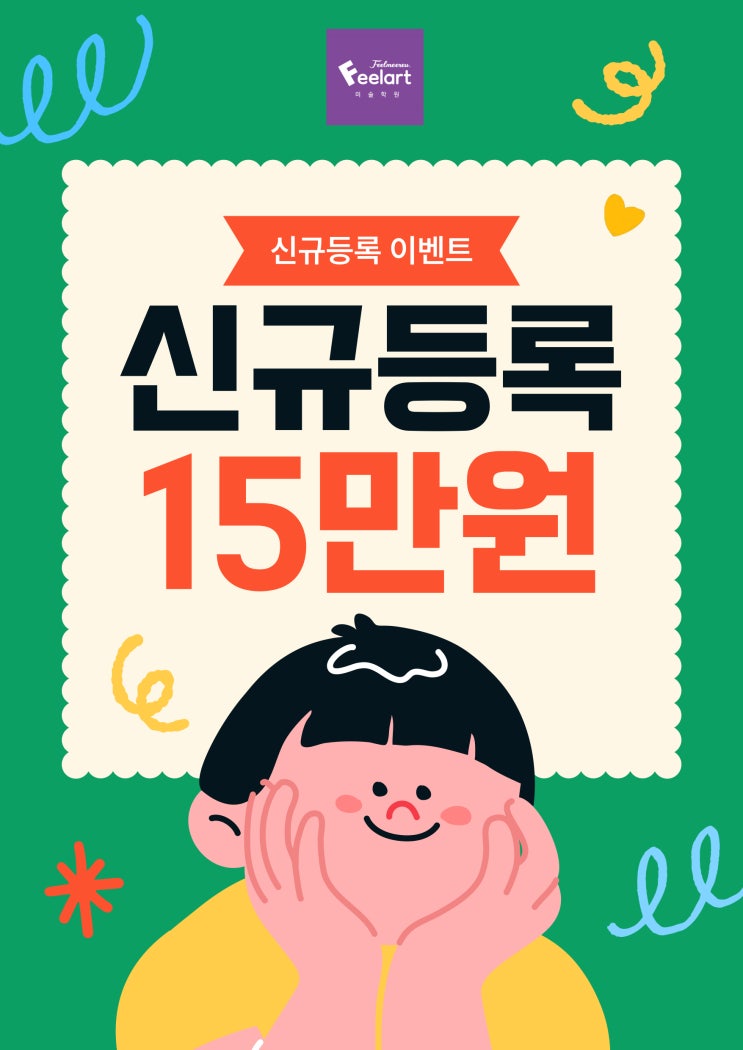 필아트 미술학원에서 우리 아이 숨은 재능을 발견하세요! ️ ❤️새 학기 적응으로 고민 많으신 학부모님들을 위해 필아트 미술학원에서 ‘신규 등록 15만 원 릴레이’ 이벤트를 진행합니다. 단순한 그리기를 넘어 아이들의 생각을 표현하는 즐거움을 가르칩니다. 3개월 차부터는 정상 수강료가 적용되는 한정 이벤트인 만큼, 신학기 시작을 필아트와 함께 기분 좋게 시작해 보세요! • 혜택: 첫 달 & 두 번째 달 수강료 각 15만 원 • 참여 방법: 010-9984-5020으로 아이 이름과 나이를 문자로 남겨주시면 확인후 연락드리겠습니다. • 참고: 신학기 특별 혜택으로 선착순 10분께만 드립니다.! <img src="https://blogthumb.pstatic.net/MjAyNjAyMDZfMjc2/MDAxNzcwMzUwMjU4Mzk2.I9UMzRYPMytFA4GPItJQpIgfe7VjKdcEF4pRXcCH9vog.nWXqEfhBeAFpcdiE1Tx0Q7d84T-lbYCuixflC4vvBJwg.JPEG/%BD%C5%C7%D0%B1%E226%B3%E2%BB%F3%B9%DD%B1%E21.jpg?type=s3" />