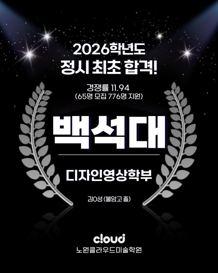 2026학년도 정시 최초 합격 경쟁률 11.94 (65명 모집 776명 지원) 백석대학교 디자인영상학부 김0성 (불암고 졸) 노원클라우드의 정시 합격 소식~~ 백석대 영상디자인학부 정시 최초합 소식입니다~~♥ 첫 정시 합격소식을 들려주어서 고마워요~ : ) 앞으로 남은 발표들도 좋은 소식 있기를 바랍니다!! ★ 합격을 진심으로 축하합니다 ★ #노원클라우드미술학원 문의전화 : 02-939-9982 #창동미술학원 #창동디자인입시 #창동디자인미술 #노원클라우드미술학원 #백석대합격 #백석대디자인영상학부 <img src="https://blogthumb.pstatic.net/MjAyNjAxMjhfMTY0/MDAxNzY5NTg2OTYyOTA5.NWMzs1lgRwJCJG3yFe7fGTf1lwy7DPp8KQ_6oSPrfa8g.3PlvgdQMWrTlDP5EUul9XGnRwT80_2su_JuxamXoHrQg.JPEG/26_%B9%E9%BC%AE%B4%EB_%B1%E8%B9%CE%BC%BA_%281%29.jpg?type=s3" />