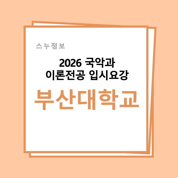 날이 한결 부드러워지고, 햇살에도 봄기운이 가득 담기는 3월의 끝자락입니다 새 학기의 분주함 속에서도 조금씩 자리 잡아가는 요즘, 새로운 목표를 향한 마음도 더 또렷해지고 있을 텐데요. 스누국악에서는 전국에 국악과가 개설된 대학교들의 입시요강을 하나씩 정리해 차근차근 소개해드리고 있습니다. 오늘 소개해드릴 2026학년도 국악이론 전공 입시요강은 ‘부산대학교’ 입니다. 어떤 전형으로 선발하는지, 무엇을 준비해야 하는지 꼼꼼하게 알려드릴게요 ✍️ 부산대학교 한국음악학과 국악이론 전공은 전통음악의 계승·발전이라는 학과 목표 아래, 이론 분야 학생들에게 한국 전통음악을 체계적으로 이해하고 분석하는 역량을....... <img src="https://blogthumb.pstatic.net/MjAyNjAyMjBfMTc4/MDAxNzcxNTU4ODU2MjE5.L_hZehrwVxXTZkSJS6lZHrfX6KYUkBCHXgmiVS3q-Hgg.JZrY30J50YUgUdXS-z70JHA6mBe28BVV5mX5_HBSsysg.JPEG/%BD%BD%B6%F3%C0%CC%B5%E51.jpeg?type=s3" />