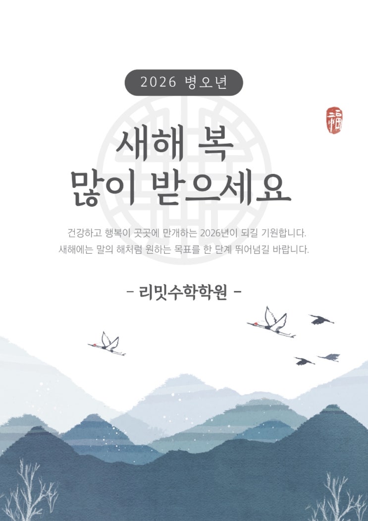 안녕하세요. 리밋 수학학원입니다. 2025년, 저희 리밋 수학학원을 믿고 소중한 자녀를 맡겨주셔서 진심으로 감사드립니다. 저희 리밋 수학학원의 이름에는 아이들이 스스로 정해둔 점수(등급)와 심리적 한계를 깨고 더 높은 곳으로 나아가길 바라는 마음이 담겨 있습니다. 2026년에도 리밋 수학학원이 학생들의 수학 실력을 한 단계 더 도약할 수 있는 곳이 되도록 노력하겠습니다. "limit"은 단순히 멈추는 지점이 아니라, 목표를 향해 끊임없이 다가가는 과정이며, 넘어서야 할 기준점입니다. 마지막으로, 학부모님 가정에 건강과 행복이 가득하시길 바라며, 아이들의 성취감이 결실을 맺는 2026년을 만들겠습니다. 새해 복 많이 받....... <img src="https://blogthumb.pstatic.net/MjAyNTEyMzFfMTA0/MDAxNzY3MTg3NTQ2NDI4.jl5UxmFHHWazhoSMg6af00bRcalnudnfCHYSBfll5rsg.nV4RytuqVvw9dh7PrZxl0KHOZ-1y82wrNtBzJtea9OUg.JPEG/900%A3%DF1767187497496.jpg?type=s3" />