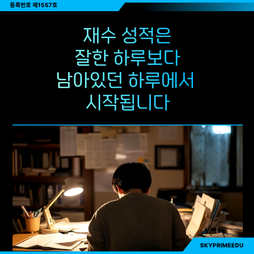안녕하세요, 포항독학재수전문학원 #스카이프라임에듀 입니다. 재수를 시작하면 누구나 이런 날을 꿈꿉니다. 컨디션이 좋고, 집중이 잘 되고, 계획한 공부를 모두 해낸 하루!! 하지만 현실의 재수 생활은 그렇게 매끄럽지 않습니다. 오히려 더 많은 날은 흔들리고, 지치고, 마음이 무너집니다. 그럼에도 성적이 오르는 학생들은 분명히 존재합니다. 그 차이는 의외로 단순한 곳에서 갈립니다. 잘한 하루의 강도가 아니라, 포기하지 않은 하루의 개수입니다. 많은 재수생들이 스스로를 이렇게 평가합니다. “오늘은 망했어.” “공부가 하나도 안 됐어.” 그리고 그 하루를 실패로 규정해버립니다. 하지만 재수는 하루 단위로 성적이 만들어지는 싸....... <img src="https://blogthumb.pstatic.net/MjAyNjAyMDFfNDEg/MDAxNzY5OTM5Nzc0MjA4.ZjCQvKhmrZxK5MHT9T0qlc01RwQhjR5ATFEuBxpDtaEg.yCIZQXnl1n0gCwyfpGzEPCglBG5_2K9TFC3jwYa2LT0g.PNG/1769938875118.png?type=s3" />