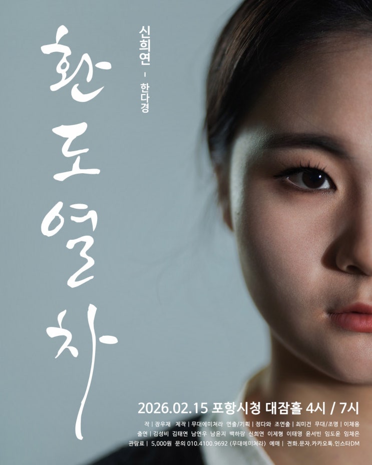 극단 고-온 제7회 정기공연 [환도 열차] 환도 열차 인물 포스터 2026. 02. 15 (일) 4시 / 7시 포항시청 대잠홀 작 : 장우재 제작 : 무대에 미쳐라 연출/기획 : 정다와 조연출 : 최미건 러닝타임 : 90분 전석 : 5,000원 출연 : 김성비 김태연 남연우 남윤지 백하람 신희연 이제형 이태영 윤서빈 임도윤 임채은 Synopsys 휴전협정이 체결된 직후인 1953년, 피난민을 태우고 부산에서 서울로 향하던 ‘환도열차’가 굉음과 함께 사라진다. 그리고 60여 년 뒤인 2014년, 그 열차가 아무 일도 없었다는 듯 서울 한복판에 다시 나타난다. 그러나 객차 안은 아수라 장이다. 탑승자들은 모두 죽어 있고, 오직 한 사람 ‘이지순’만이 살아남아 구조된다. ....... <img src="https://blogthumb.pstatic.net/MjAyNjAyMDRfMTUz/MDAxNzcwMTg2NTcxODEy.VGiU5vAvaHevxmnNjcIHq0t56TiE7GQQjuYCDMgBI4Ug.HdzzwFcqJOX0zs0GjDUbp2ylHQePr2p2fOJ5tFSjkcUg.JPEG/KakaoTalk_20260204_152506414_10.jpg?type=s3" />