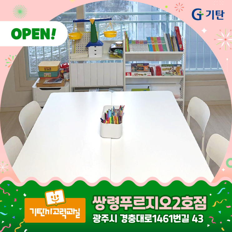 안녕하세요! 아이들의 잠재력을 깨우고 탄탄한 학습 기초를 세워줄 광주시 쌍령동 기탄공부방이 새롭게 문을 열었습니다. 학습의 즐거움을 깨닫고 스스로 사고하는 힘이 형성되는 곳, 쌍령동 기탄공부방의 쾌적한 학습 환경과 차별점을 상세히 알려드립니다. 집중력을 극대화하는 화이트 톤의 감각적인 인테리어 학습 공간의 분위기는 집중력 향상에 결정적인 역할을 합니다. 쌍령동 기탄공부방은 학습자가 심리적 안정감을 느끼며 공부에 몰입 할 수 있도록 세심하게 설계되었습니다. 화이트 톤의 깔끔한 가구 배치 전체적으로 화이트 컬러의 책상과 의자를 배치하여 공간이 넓고 쾌적해 보이도록 구성했습니다. 시각적인 피로감을 최소화....... <img src="https://blogthumb.pstatic.net/MjAyNjAyMDZfMjQ2/MDAxNzcwMzYxNTU1MzU3.77Uo3mV6V3GCsVWjBKb7jls8uMNHv8cz_LV2NuiYhJ8g.wzfqBua4gJ4RQwyiW2kUO6jxB7OAHa4NWSymiQMzOTAg.PNG/2601_19_%C1%A4%B9%E6%C7%FC_%BD%D6%B7%C9%C7%AA%B8%A3%C1%F6%BF%C02%C8%A3%C1%A1.png?type=s3" />