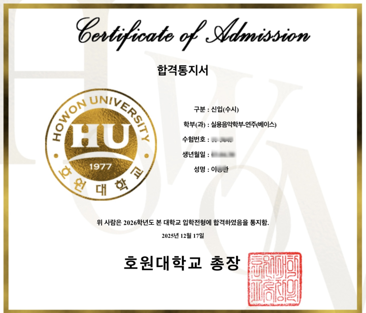 2026년도 합격생 호원대학교 실용음악과 (베이스) 한양여자대학교(보컬) 정화예술대학교(보컬) 재능대학교(드럼) 아현산업정보고영재반 (보컬) 아현산업정보고등학교 (보컬) 서초문화예술정보학교 (드럼) SM 엔테테인먼트 오디션 1차 합격 (보컬) 2025년도 합격생 호원대학교 (드럼) 성신여자대학교 (드럼) 정화예술대학교 (드럼) 아현산업정보고등학교(보컬) 동덕여자대학교 (예비 드럼) 한양여자대학교 (예비 보컬) 2024년도 합격생 서울예술대학교 (기타) 1명 호원대학교 (베이스,드럼) 2명 서울신학대학교 (베이스,드럼) 2명 백석예술대학교 (베이스,드럼,피아노) 5명 누적 합격자 서울예술대학교 4명 (1차합격) 서울예술대학교 1명 (2차합격....... <img src="https://blogthumb.pstatic.net/MjAyNjAyMDlfMjcz/MDAxNzcwNjEzNDc3NjQ5.kRM58Mb4aI7amTLWKj2dizyzqSlZ-LvQpVA-L4yDQHsg.jM4ljJaSQoSsBF-VKXY2Qhubvdi5TCcI6VzRvYaQ52Ug.PNG/image.png?type=s3" />