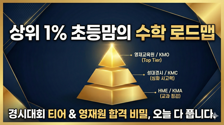 새학기가 시작되는 3월 맘카페에서 가장 많이 보이는 질문 중 하나 주변 아이는 벌써 성대경시 준비한다는데 우리 아이도 HME이라도 준비해야 하나요? 아이의 현재 수학 수준과 성향을 모른채 무작정 경시대회를 밀어넣는 것은 아이를 수포자로 만드는 지름길입니다. 오늘은 2026학년도 초등수학경시대회 어떤 대회들이 있는지 또한 영재원을 목표로 하는 학부모님이라면 궁금해할 로드맵을 정리해 볼게요. 목적별 초등수학경시대회 급(Tier)나누기 경시대회라고 해서 다 같은 경시대회가 아닙니다. 목적에 따라서 난이도와 출제경향이 완전히 다른데요. 우리 아이의 현재 위치를 파악하고 다음 단계로 넘어가야 하죠 1단계 : 교과점검 & 자....... <img src="https://blogthumb.pstatic.net/MjAyNjAyMTZfMjA1/MDAxNzcxMjM3MTk4MjY1.cVrJ-ePMt9o3jVkwChP77d9JUvdsG_8wfSSyj5rAjswg.Z4aEHcaTlAMeL5A3sjtpIMH0gSCNqkirkZqUr9Pxp-Ug.PNG/Gemini_Generated_Image_cmt4j4cmt4j4cmt4.png?type=s3" />