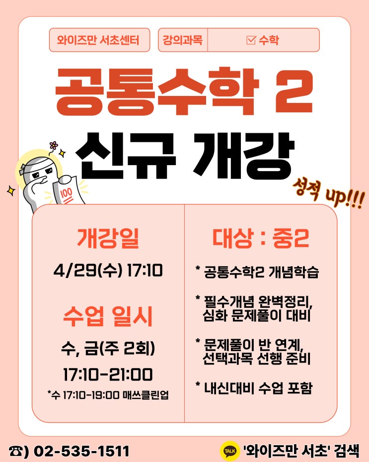 와이즈만 서초센터 공통수학2 신규반 개강 안녕하세요 와이즈만 서초센터입니다^^ 1학기 중간고사 이후 학생들의 학업을 지속할 수 있는 신규반을 개강합니다. 많은 수학 상위권 학생들이 중2 1학기 후 고등 수학 선행을 시작합니다. 이 시기의 선행 공부를 얼마나 착실하게 하느냐에 따라 고등학교에서의 성적이 좌우된다고 해도 과언이 아닙니다. 수능까지 이어지는 선행 학습, 수학 학습의 뼈대를 세워야 합니다. < 공통수학2 신규반 개강 > 개념학습 + 문제풀이 - 8개월 과정 * 개강일 * 4월 29일 수요일 오후 17:10 * 수업 시간 * 수, 금요일 오후 17:10 ~ 21:00 ※ 수요일 17:10 ~ 19:00 매쓰클린업 매쓰클린업이란? ↓ * 대상 * 중....... <img src="https://blogthumb.pstatic.net/MjAyNjA0MDFfMTY2/MDAxNzc1MDMyMDA3NTMx.qpsb79Hnuj2sym3PG-aLUtBz5wAzE3vqIKYZTCz8me0g.zuwTdEoF8z95kVLhEvDhXPGaf4a0UAcFLeDt5oT32jMg.JPEG/%B0%F8%C5%EB%BC%F6%C7%D0_%B0%B3%B0%AD-001.jpg?type=s3" />