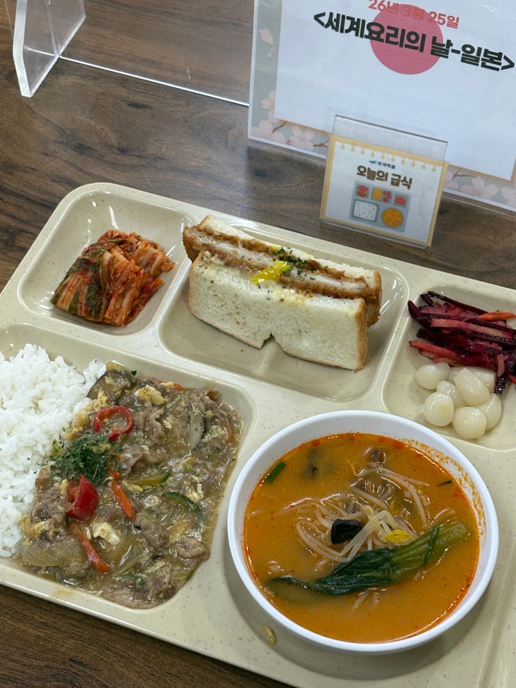 안녕하세요. 기숙학원의 명작 김해기숙학원 은석학원입니다. 은석 맛집 수오재 3월 세계요리의 날 특식 이벤트 현장을 가지고왔습니다! 매일 반복되는 일과 속에서 학생들에게 작은 변화가 필요한 순간이 있지요 :) 오늘의 세계요리는 바로 일본입니다 맛있지만 부담 없는 식사 맛있게 먹되, 공부에 방해되지 않도록 기름지거나 너무 무거운 음식이 아니라 소화가 잘 되고 부담 없이 먹을 수 있는 구성으로 준비했습니다. 오늘의 메뉴를 소개합니다 ✔ 일본식 소고기덮밥 ✔ 매운 돈코츠 장국 ✔ 미니 카츠산도 ✔ ABC샐러드 ✔ 락교 & 배추김치 일본식 소고기덮밥 (규동) 일본 대표 덮밥 요리인 규동입니다. 직접 가쓰오부시로....... <img src="https://blogthumb.pstatic.net/MjAyNjA0MDFfMjA1/MDAxNzc1MDA3NDEwNjYw.LAFzHlE7KK2AAnFgPaqN3Qem3gT8UH1f0JlPVh-y1mgg.4r1Y-TTBkedrb9zkIEd_MA_TbeeR2Wx_StP1g7OOYRwg.JPEG/KakaoTalk_20260325_124822296.jpg?type=s3" />