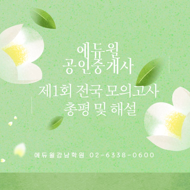 안녕하세요, 강남공인중개사학원 에듀윌 공인중개사 강남학원입니다. 모의고사에 응시하신 회원님들 정말 고생 많으셨습니다~ 제1회 실전 모의고사 시험총평 및 학습방향 전해드리오니 학습에 참고 부탁드립니다. ^^ 에듀윌 제3회 전국 모의고사 해설 총평 부동산학개론 (난이도: 하) 출제교수 : 장혁 <시험총평> 3월 모의고사는 기본에 많이 충실하려고 노력하였습니다. 우리 시험에 자주출제 되는 내용으로 구성을 하였습니다. 그래서 기본적인 개념을 묻는 유형의 문제를 중점적으로 출제하였습니다. 문항 수의 배분도 실제 시험의 비중에 따라 구성하였습니다. 앞으로 계산문제의 난이도나 문항수를 조금씩 늘려나갈 예정입니다. <학....... <img src="https://blogthumb.pstatic.net/MjAyNjAzMjlfMTY4/MDAxNzc0NzczMTE3NzI2.QiuKwDBLa8gZmQ0PYVLMeHVVFcK2scWsYXHQHo_sYVUg.wZxMry2AC4uCkQ5Nbn4WBehXre5_dUGnd2O2QymZNrkg.JPEG/%3F%A0%9C%EB%AA%A9%EC%9D%84_%3F%9E%85%3F%A0%A5%3F%95%98%3F%84%B8%3F%9A%94_%283%29.jpg?type=s3" />