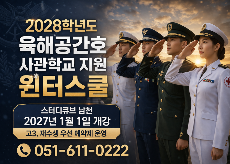 부산 지역 사관학교 지원 대상 윈터스쿨 과정이 2027년 1월 1일 부터 스터디큐브(남천)에서 예비고등3학년,재수생들 대상으로 개강을 시작 합니다. 매년 육군,공군,해군,간호사관학교 지원 경쟁률은 높은 수치로 전국 학생들의 높은 선호도를 보여주고 있습니다. 어려워진 1차 국어,영어,수학 시험의 난이도는 수능 시험과 다른 유형으로 학생들이 접해 보지 못한 문제들이 대부분 입니다. 지원 학생들의 내신 등급이 좋지 않더라도 1차 시험 커트라인 통과가 합격으로 가는 가장 핵심 사항이며 9월 부터 체력시험,면접 고사를 준비하는 과정에서 부산 사관학교 윈터스쿨 개강을 시작하는 스터디큐브는 국영수 선생님들의 수업을 통해 겨울 방학....... <img src="https://blogthumb.pstatic.net/MjAyNjA0MDJfMjQ2/MDAxNzc1MTMxNjYyOTEz.t7PJrHVLfZj_ftmEQ2KROR1n6b7kn7n_t40RLb6uLLAg.OqrfrZNT4P8n3E22Qk9AwnnnEVNS8rsWkNRGVxHvMnog.PNG/45.png?type=s3" />