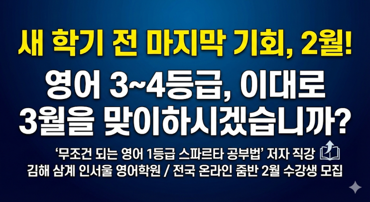 안녕하세요! 인서울 영어학원 원장 권장미 입니다!! 벌써 1월의 끝자락이네요^^ 2026년의 시작이 어제같은데... 1월이 벌써.... 우리 학생들에게 방학은 정말.. 황금보다 더 귀한 시간이죠?? 사실 학기 중에는 방학동안 바꿔 놓은 그 등급, 그 점수를 유지 하기 위해 달리는 것 뿐이라는 거.. 아시는분들은 다들 알고 계시니까요^^ 자, 그럼 본격적으로 오늘의 본론으로 들어가겠습니다!! 지금 우리 아이의 영어 실력은 안녕하십니까? 혹시 "겨울방학 동안 열심히 해야지" 다짐만 하고, 1월을 어영부영 보내지는 않았나요? 2월은 새 학기가 시작되기 전, 영어 등급을 근본적으로 바꿀 수 있는 마지막 '골든타임'입니다. 이 짧....... <img src="https://blogthumb.pstatic.net/MjAyNjAxMjBfMTcx/MDAxNzY4OTEyNDIzOTkx.IzL_jRh2m6a43_KQyoj-Pm6apm7lp4dgDVjIRuKFLXEg.HsmehtqFNVjBPvGJqCaM9Wsijag0H-Kw3oRyhju8f6Ug.PNG/image.png?type=s3" />