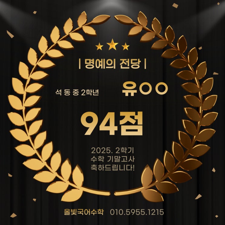 세상에 빛나지 않는 별은 없다! 안녕하세요. 진해 국어, 수학 학원 올빛국어수학입니다. 2025. 2학기 수학 기말고사 우수생입니다. 석동중 2학년 유OO 학생 진심으로 축하합니다. 해당 학생은 올빛국어수학 등록 후 4연속 명예의 전당에 오르는 등 우수한 성적을 거두었습니다. 다시 한 번 진심으로 축하합니다. 이상 올빛국어수학이었습니다. 감사합니다 (학교 성적 우수생은 1명씩 순차적으로 포스팅 예정입니다) <img src="https://blogthumb.pstatic.net/MjAyNTEyMjRfMTE5/MDAxNzY2NTYzOTk4NjU4.hRfcFTTf6M834A39ZfgKloa57R1YaJ28t5T9x9NAZNwg.se-8D2mY1_m8YjOm6kW-kJEAX38jd5nPJjG6emicz04g.JPEG/%C1%A6%B8%F1%C0%BB-%C0%D4%B7%C2%C7%D8%C1%D6%BC%BC%BF%E4_-001_%282%29.jpg?type=s3" />