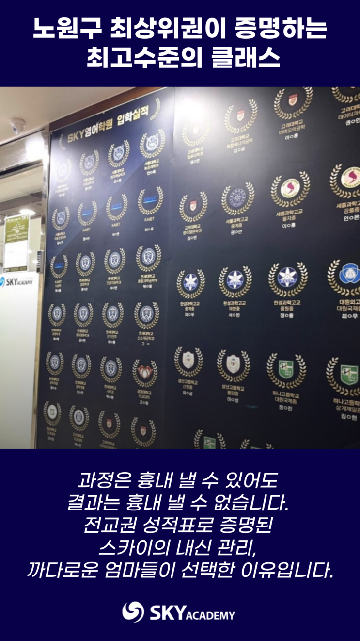 #중계동영어학원 #노원구영어학원 #내신1등급 #중계동고등영어 #노원구고등영어 #서술형대비 #노원구상위권 #스카이영어학원 #은행사거리영어학원 #중계동내신학원 #고등영어내신 #수능영어독해 #영어1등급 #중계동학원추천 #대진고영어 #서라벌고영어 "중간고사 97점과 96.9점. 이 미세한 0.1점 차이가 1등급과 2등급의 운명을 가릅니다." 숨 막히는 긴장감, 이것이 바로 우리가 마주한 노원구 내신 전쟁의 민낯입니다. 수능은 전국의 학생들과 경쟁하지만, 내신은 바로 옆자리의 친구, 그리고 어제까지 함께 공부했던 전교권 아이들과의 피 튀기는 '상대 평가' 싸움이기 때문입니다. 그래서 노원구 상위권 학생들에게 내신....... <img src="https://blogthumb.pstatic.net/MjAyNTEyMjRfMjMg/MDAxNzY2NTUxMTk1MTIz.TuenKJ8IhSLnuMnqu8jw12DDKAN1I0VgattKDWt0RZIg.leiR5_S4WBcLYoNl0fqteSqdx9UYUOGcNnACx586RGog.PNG/006.png?type=s3" />