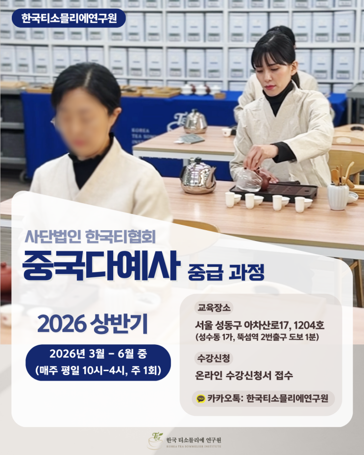 안녕하세요! 현업 식음료 종사자가 믿고 선택하는, No.1 티 전문 교육 연구기관 '한국티소믈리에연구원'입니다. 저희 한국티소믈리에연구원은 보다 전문적이고 체계적인 교육 서비스와 티 관련 도서 출판 등 다양한 콘텐츠를 통해 여러분들이 더 쉽고 재밌게 티의 세계로 한발짝 다가설 수 있도록 함께하고 있습니다. 많은 분들의 성원과 관심에 힙입어, 2026년 중국 다예사 과정 상반기가 개강될 예정입니다. 작년에도 많은 관심에 많은 분들이 신청해주셨고 좋은 결과를 얻어가셨습니다. 조금은 생소할 수 있는 중국 다예사! 어떤 과정인지 차근차근 알아가볼까요? LET'S GO ️ 교육....... <img src="https://blogthumb.pstatic.net/MjAyNjAyMTJfMjAx/MDAxNzcwODg2ODg1MjQy.I5v_FugtTIWP6HRTPMbtnA-1pjQLchNvwjgdC27FKKIg.DB4bqJ7klrBtapjE43cV3gydgooaNpJN-3Jb3r8Jg88g.PNG/%C1%DF%B1%B9%B4%D9%BF%B9%BB%E71.png?type=s3" />