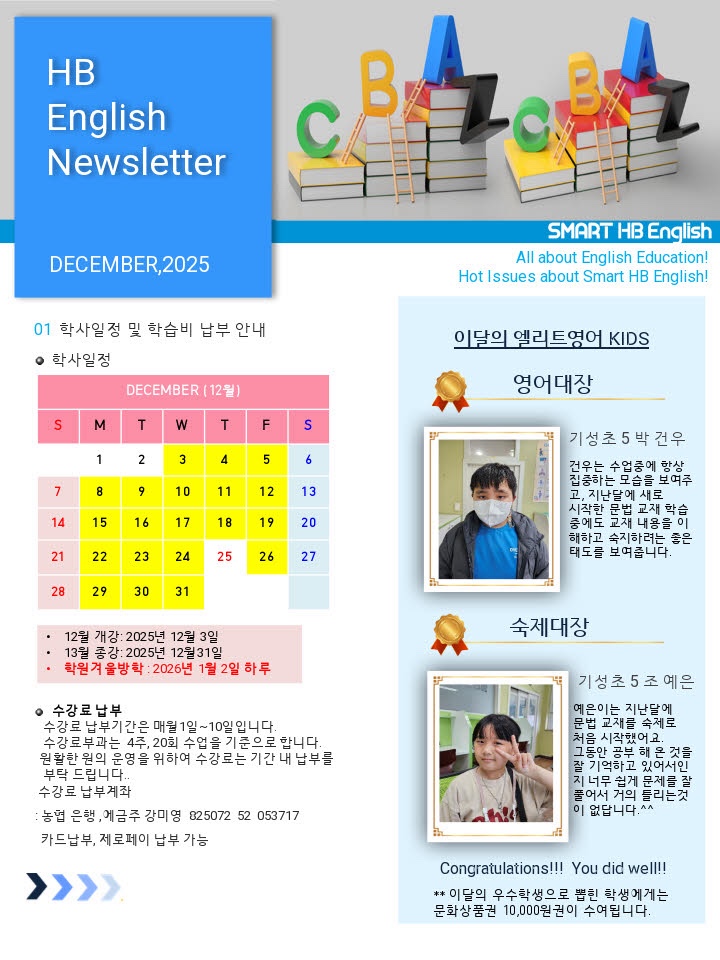 이달의 엘리트 영어학원 우수 학생 이번 달에도 수업 태도와 학습 성취도가 뛰어난 원생들이 선정되었습니다 성실한 노력과 꾸준한 학습 태도로 좋은 본보기가 되어준 친구들을 소개합니다. 영어대장 기성초 5학년 박건우 박건우 학생은 수업 시간마다 높은 집중력을 유지하며 단어 암기와 문장 이해에 매우 성실한 모습을 보여주었습니다. 질문에도 적극적으로 참여하며, 항상 최선을 다하는 태도가 인상적인 학생입니다. 숙제대장 기성초 5학년 조예은 조예은 학생은 숙제를 한 번도 빠짐없이 성실하게 해오며 틀린 문제를 스스로 다시 확인하는 책임감 있는 학습 태도를 보여주었습니다. 차분하지만 꾸준한 노력으로 실력....... <img src="https://blogthumb.pstatic.net/MjAyNjAxMTVfMjQg/MDAxNzY4NDExMTgyNTQz.c8kHg_vMKT_EojrSHvjpCmUzhsxk215lhCprsOh053Eg.TV4ax7jU1HWRRgt-B9kV7Rbmw5Y-an9NfLuNFlIBilwg.JPEG/IMG%A3%DF2417.JPG?type=s3" />