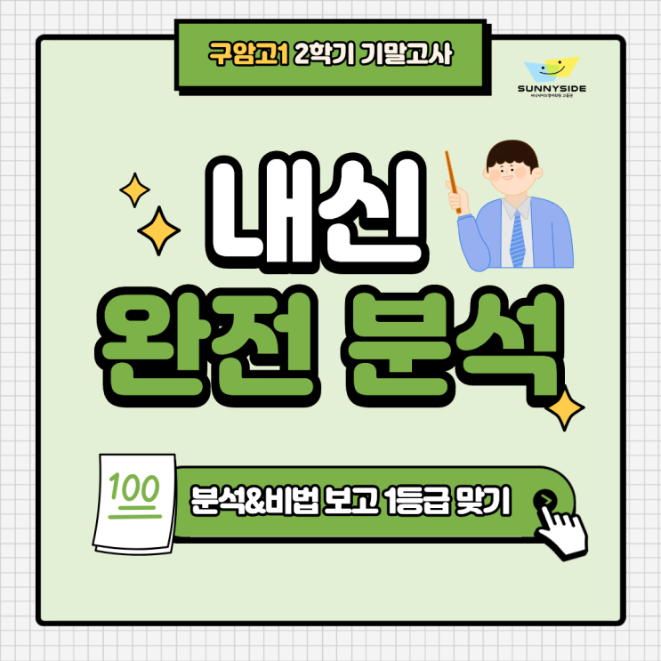 안녕하세요. 써니사이드 부원장 하대운 입니다. 오늘은 써니사이드 고등관 구암고 1학년 영어 2학기 기말고사 시험분석을 하려고 합니다. 작년부터 구암고는 써니사이드 고등관의 메인 고등학교가 되었습니다. 한글 보기는 하나도 없고 영어 보기만 있는 구암고 시험을 잘 볼 수 있었던 비결은 대운쌤(부원장) PICK의 완전 적중률 덕분이라고 생각합니다. 시험 대비 때 변형 공부뿐만 아니라 반복 학습 하면서 강조한 내용들이 다수 출제되었기 때문에 써니사이드 고등관에 다니는 구암고1학년 아이들은 쉽게 느껴졌다는 리뷰도 많았던 시험입니다. 1. 구암고1 출제 분석입니다. 2. 구암고1 시험총평 및 전략입니다. 3. 구암고1 적중지도 유사문....... <img src="https://blogthumb.pstatic.net/MjAyNjAxMjJfMjI5/MDAxNzY5MDgzODI3MTYx.hX2n8f2gwF1RlJm4nC1kLtheyjiOotTr63_vUeuMhgMg.iJ8-WcExa2t5QFminDa8rO_d6pQ-ySZO1reCY_Cdu1kg.PNG/1.png?type=s3" />