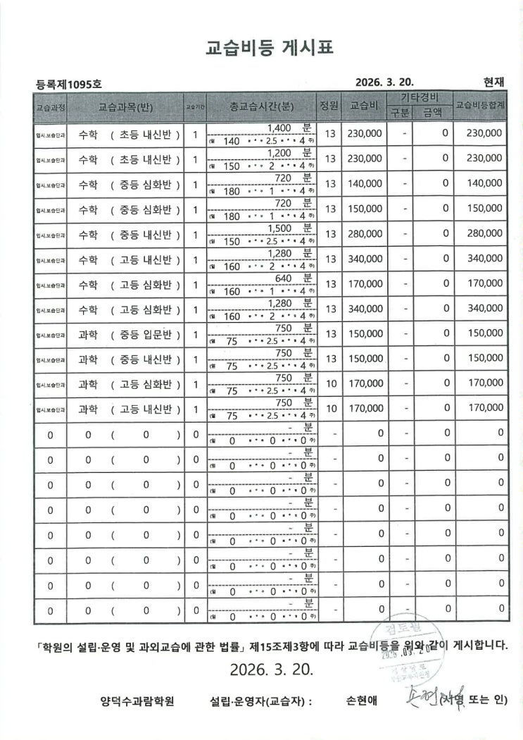 [수과람양덕분원] 교습비게시표