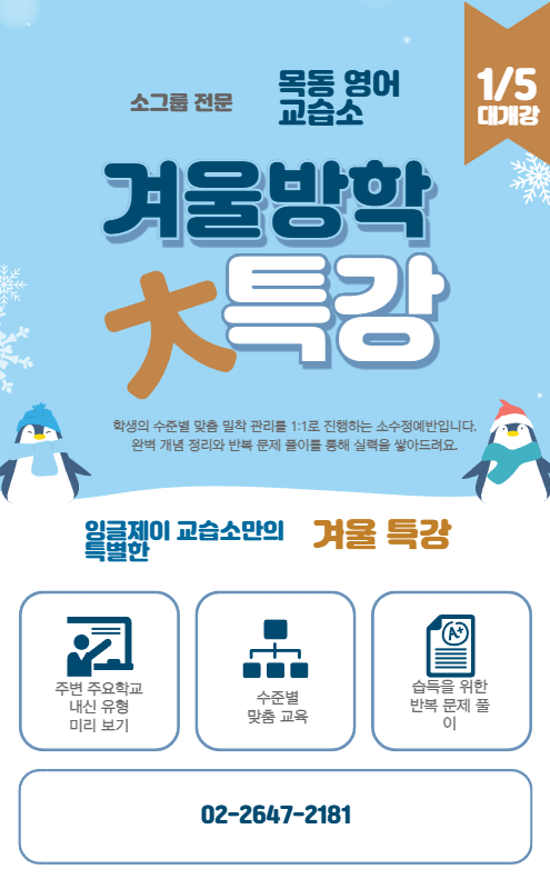 교육 대상 : 초등 5-6학년 초등 문법의 기초에서 중등 문법으로 도약할 수 있는 기회! 현재 초등 고학년들을 위한 맞춤 문법 수업입니다. 시간 : 화 . 목 1시 30분 - 3시 수업 내용 : 목동중 .목일중 기출 문법 문제 풀이 중학교 1학년과 2학년 핵심 교과 내용중 필수 문법을 실제 학교 출제 방식의 문제들로 구성하여 딱 필요한 요소들만 학습합니다 NELT 어법 어휘 온라인 과제풀이를 통해 학습자의 약점을 시스템적으로 파악하고 보완합니다. 특강비 : 8회 수업 25만원 개념과 연습을 반복하여 학교 내신 문법에서 실수 하지 않도록 체화하는 소중한 시간입니다. 1년중 가장 긴 겨울방학을 알차게 보내도록 해요 ^^ <img src="https://blogthumb.pstatic.net/MjAyNTEyMTFfMTU3/MDAxNzY1NDQzMzEzMDk2.XTym-cpvwRbZ1hgF-JtKfNnVKtKI3bZSPTJMIs6VOewg.GVNAfMkHoqyWbg_MGbtYJ_OpAUA7oRYbf2OEjHa5bVgg.PNG/1211.png?type=s3" />