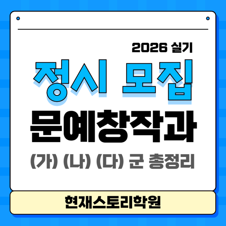 안녕하세요~! 문예창작, 극작, 영화, 웹소설과 입시전문 - 현재스토리학원 입니다. 오늘은 2026 문예창작과 정시에 대비하기 위해서 2026 문예창작과 정시 입시 요강을 공유해드리려고 합니다! 문예창작과 정시 모집 요강(2026) _ 추계예대, 중앙대, 단국대, 명지대, 숭실대 실기고사를 통해 원하는 대학의 문창과에 합격하기 위해서는 실기 기출문제를 분석 및 풀이하는 것이 정말 중요한데요, 현재스토리학원에서는 모든 학생들이 문예창작과, 극작과, 웹소설과, 영화과 등 2026년 모집요강과 기출문제 분석 등 매주 대학 입시 모의문제를 풀어보고 선생님께 첨삭을 받으며 입시 훈련에 매진하고 있습니다. 문예창작과 정시 모집 요강(2026) _ ....... <img src="https://blogthumb.pstatic.net/MjAyNTEyMTFfMTk4/MDAxNzY1NDUxNDk5NDA0.Y3KRHVt5YMDcXwMBFBaruIX30MNAX1zILSZZu04_zYgg.ki_aJv5cWRdo7WMYgdEh43Wx-L5Zvb3281bVLgUzW3Yg.PNG/011.png?type=s3" />