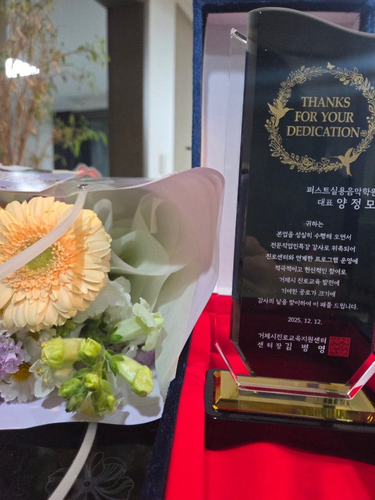거제시 진로교육지원센터 감사패 수상 퍼스트 실용음악학원 양정모 원장님이 거제시 진로교육지원센터에서 감사패를 받았습니다❤️❤️ 적극적이고 헌신적인 노력으로 거제시 청소년들을 위한 프로그램과 교육을 펼친 원장님!!!축하해주세요 앞으로도 문화예술교육에 더 힘쓰는 퍼스트가 될게요 #거제시진로교육체험센터 #감사패수상 #퍼스트실용음악학원거제통영 #진로체험 #음악교육 <img src="https://blogthumb.pstatic.net/MjAyNTEyMjRfNDQg/MDAxNzY2NTU0NzIzMjQ1.402dtb5HUni5XrLnNxOeUMi-C7Mi9SR0A8JdDd1WJIkg.aNxiX92-C6Jk-wgMTR9rE3H4Bi4mVSYVbwt8P2ebXTIg.JPEG/900%A3%DF20251212%A3%DF172726.jpg?type=s3" />