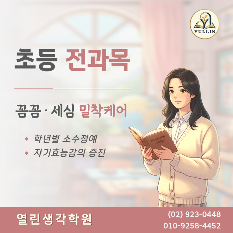 안녕하세요. 열린생각학원 초등부 전과목 쌤입니다. 국어,사회,과학을 담당하고 있으며, 저학년(1~3학년)의 경우는 수학도 함께 맡고 있어요 제 수업을 한마디로 정리하자면, "꼼꼼하고 세심한 밀착케어" 라고 부를 수 있을 것 같습니다. 여기서 밀착케어 란, '내 앞의 아이 한 명을 끝까지 책임지는 것' 이라 생각합니다. 1. 학년별 소수정예, 그래서 가능한 밀착케어 초등부 반에서 가장 먼저 갖춰야 할 것은 아이를 제대로 볼 수 있는 환경입니다. 그래서 저는 학년별로 나누어진 소규모 집중 반을 운영하고 ✌️ 수업 중에 아이들의 문제푸는 속도, 표정까지 계속 체크하고 있어요 이러한 구조 덕분에 ✅아이가 어....... <img src="https://blogthumb.pstatic.net/MjAyNTEyMjdfMjIz/MDAxNzY2NzYzNDk5OTk4.Y4G3wkR-FUw2uXJ9n4FrVAEaCvC3V_8ILa0KWEh6U64g.jpZuezcAT4nEWQsc_4MtppyPRx4lsxTmisNH2K4rsysg.PNG/%C1%A6%B8%F1%C0%BB_%C0%D4%B7%C2%C7%D8%C1%D6%BC%BC%BF%E4_%283%29.png?type=s3" />