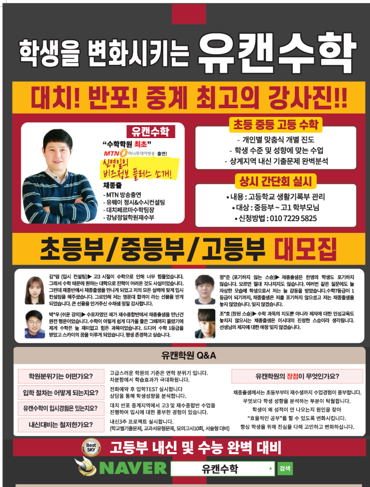 유캔수학에 초등 중등 고등 수학 수업을 시작합니다. 유캔수학은 다년간 중계, 창동 지역에서 초등 중등 고등 수학을 운영하면서 체계적인 시스템과 수학경험을 바탕으로 수학 성적 향상 및 명문대 입학까지 경험을 바탕으로 수락 고등학교, 수락 중학교, 수락 초등학교 노일 중학교, 노일 초등학교 우리 학생들의 수학 교육을 주도하려고 합ㄴ디ㅏ. 수학을 배우는 목적은 "입시"입니다. 저학년 부터 수학공부 습관과 진도가 중요합니다.. 학년이 어린 수록 수학 지식 습득이 빠르고 수학공부 습관을 만들 수 있습니다. 수학을 배우는 목적을 인지하면서 되도록 빠르게 학생들이 "수학"과목의 중요성을 인지하도록 노력하면....... <img src="https://blogthumb.pstatic.net/MjAyNTEyMjRfMSAg/MDAxNzY2NTY2MjAyNjc1.UlKgxaONc_DsPGVGyfG53ePEERGn3oaaZSYQAAlSGdIg.XiXxZNn9Q8Byld1KTz3pqQ62R-u7OhpuCKC80cJWfowg.PNG/%C0%AF%C4%B5%BC%F6%C7%D0_A4_%B4%DC%B8%E9%C0%FC%B4%DC.png?type=s3" />