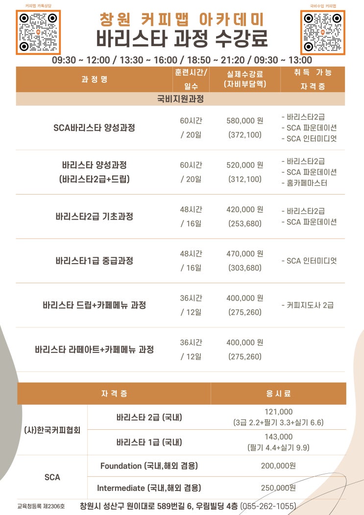 ✅ 국비지원으로 수강료 부담 ↓ 커피맵 아카데미는 고용노동부 국비지원 훈련과정(내일배움카드) 을 운영하고 있습니다. ✔ 재직자 ✔ 구직자 ✔ 실업급여 수급자 ✔ 국민취업지원제도 참여자 모두 조건에 따라 국비지원으로 수강 가능합니다. 수강료는 과정마다 다르지만, 내일배움카드를 사용하면 본인부담금만 납부하게 되어 일반 수강 대비 훨씬 부담이 적습니다. ✅ 실업급여 취업활동 인정 가능 커피맵 아카데미의 국비 과정은 실업급여 수급자 취업활동 인정 과정입니다. ✔ 하루 3~4시간 이상 훈련 과정 ✔ 고용24 등록 과정 ✔ 출결 관리 및 수료 기준 충족 → 위 조건을 충족해 실업급여 구직활동(취업활동)으로 인정됩니다. 실업급여....... <img src="https://blogthumb.pstatic.net/MjAyNTEyMzFfMjU4/MDAxNzY3MTM5MzkwMDky.d8ZUsWVIOHUfxmAYV4Nz4AYsRvscwj54d8bFKzzLUngg.yPSi_rPf1mr5Ig57HWPb4AeFczYZS9EqcAR_0vNMNDEg.JPEG/2026_%BC%F6%B0%AD%B7%E1.jpg?type=s3" />