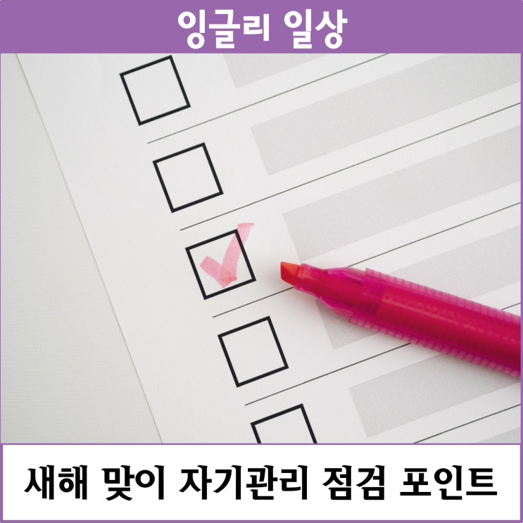 안녕하세요. 잉글리시아이입니다:) 희망찬 새해가 밝았습니다. 새해에는 모두 건강하고 소망하시는 일을 이루시길 바랍니다. 새해를 맞이하여 자기관리를 다시 한번 점검하고, 계획해 보는 것은 어떨까요? 오늘은 새해맞이 자기관리 점검 포인트에 대해 함께 알아보기로 해요! 시간 관리 점검하기 목표를 효율적으로 달성하기 위해서는 지난 시간 자신이 어떻게 시간 관리를 해왔는지 되돌아보며 점검해 보는 것이 어떨까요? 시간을 불필요하게 사용한 적은 없는지, 지난 한 해 목표 달성을 위해 시간을 효율적으로 사용했는지 등을 점검해 보는 것입니다. 아쉬운 부분이 있다면 올해는 시간을 더욱 효율적으로 사용할 수 있도록 하루, 주간, 연....... <img src="https://blogthumb.pstatic.net/MjAyNTEyMzFfMjkx/MDAxNzY3MTczMjcxODky.kYAk2JciLOZuMo_KbEFRi3ia_PoJQ1MtRhWiGlsXsH4g.tOo8StSfM-VEivcAGQ639ZTfEbZSixtfGAu_SaFKZUog.PNG/%B1%D7%B8%B21.png?type=s3" />
