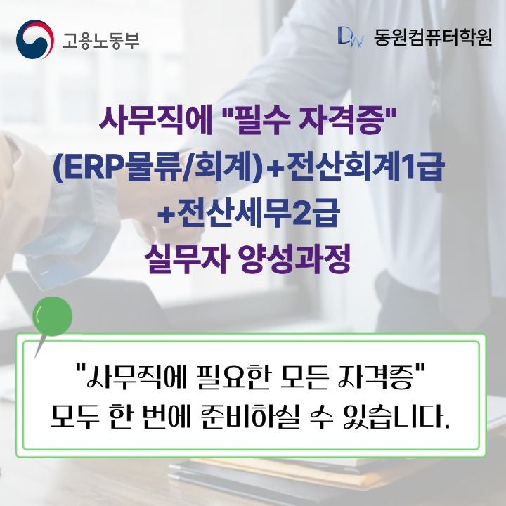 안녕하세요 동원컴퓨터학원입니다. 사무직으로 가는 끝판왕!! 자격증을 안내드리고자 합니다!! ⚡어떤 과정인가요?? 이번 과정은 ERP(물류/회계),전산회계1급,전산세무2급 +OA자격증까지 취득할 수 있는 과정에 관하여 안내드리고자 합니다. 취업의 끝판왕 자격증 모두 모아놨죠^^ 사무직으로 취업하고 싶은데, 자격증이 따로따로라 정리가 안되고 실무 경험이 없어서 이력서 쓰기 막막하신 분들 많으시죠?? 그래서 준비한 과정이 국가기간전략훈련 ERP물류/회계,전산회계1급,전산세무2급 컴활2급까지 모두 수강할 수 있는 과정입니다. ✔ ERP물류,회계 → 전표 처리, 회계, 물류, 자재.매출.재고 관리 ✔ 전산회계 1급, 전산세무2급 → 회....... <img src="https://blogthumb.pstatic.net/MjAyNjAyMDlfMjg3/MDAxNzcwNjA3NzQ2MzEy.yOqBTZtv-BDLRSNveonRHc2bc0yutNAM1JQb6-ASzuog.YVy5P9bQ-idb0qguMoHKOCUlQETsCz_n6k7I39Fmc8Ig.JPEG/%C1%A6%B8%F1%C0%BB_%C0%D4%B7%C2%C7%D8%C1%D6%BC%BC%BF%E4._%281%29.jpg?type=s3" />