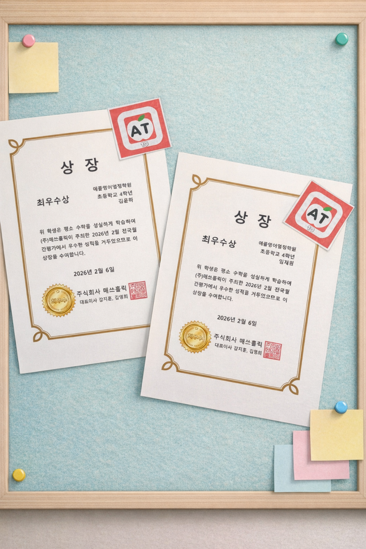전국 단위 시험 매쓰홀릭 월말평가에서 상위 4% 이내 우수한 성적을 받은 울 친구들!! 1등급 상 최우수상 축하해요~ 지금처럼 계속 열심히 해주길~~ <img src="https://blogthumb.pstatic.net/MjAyNjAyMTRfMTA2/MDAxNzcxMDYzMjMyNzU3.jFQSmBjWoJE6G2ffK5TQ0_4gE9X_WS20SZsRYQcJeU0g.TnAkqzh80InleDz4EZp3kBtppEgxyTXNp1evcbedQFEg.PNG/%C3%D6%BF%EC%BC%F6%BB%F3.png?type=s3" />