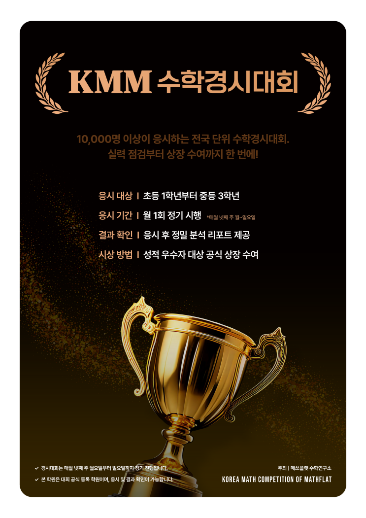#사고력발전소수학전문학원 에서는 매월시학경시대회를 실시합니다 #HME #KMA 등 많은 수학경시대회가 있습니다 우리 학생들도 경시대회에 참가하여 좋은 결과를 받았습니다 코로나시기에는 학원이 고사장이 되어 따로 고사장을 찾아가지 않아도 시험 응시가 가능했는데 코로나 해제 이후에는 따로 고사장을 찾아가야 하고 전반기 한번 후반기 한번 일년에 두번 응시가 가능합니다 응시료도 지불해야 합니다 사고력발전소수학전문학원에서는 학생들의 취약점을 분석하여 개인별 맞춤수업을 제공하기 위해서 문제은행 프로그램을 이용하고 있습니다 문제은행 프로그램에서 올해 4월부터 #KMM수학경시대회 를 출시하여 매월 비용없이 고사장을 찾아....... <img src="https://blogthumb.pstatic.net/MjAyNTEyMTNfMjUg/MDAxNzY1NTkzNjY3ODA5.S0VbmJ3JqDFIMPPewjyz66zmY5ANkjvve_2lUGGUftgg.kFYReRbKrLZeHUQzUJjp3lPTEvQCO_98gizFG1O7G58g.PNG/KMM_%C8%AB%BA%B8%C6%F7%BD%BA%C5%CD_Black.png?type=s3" />