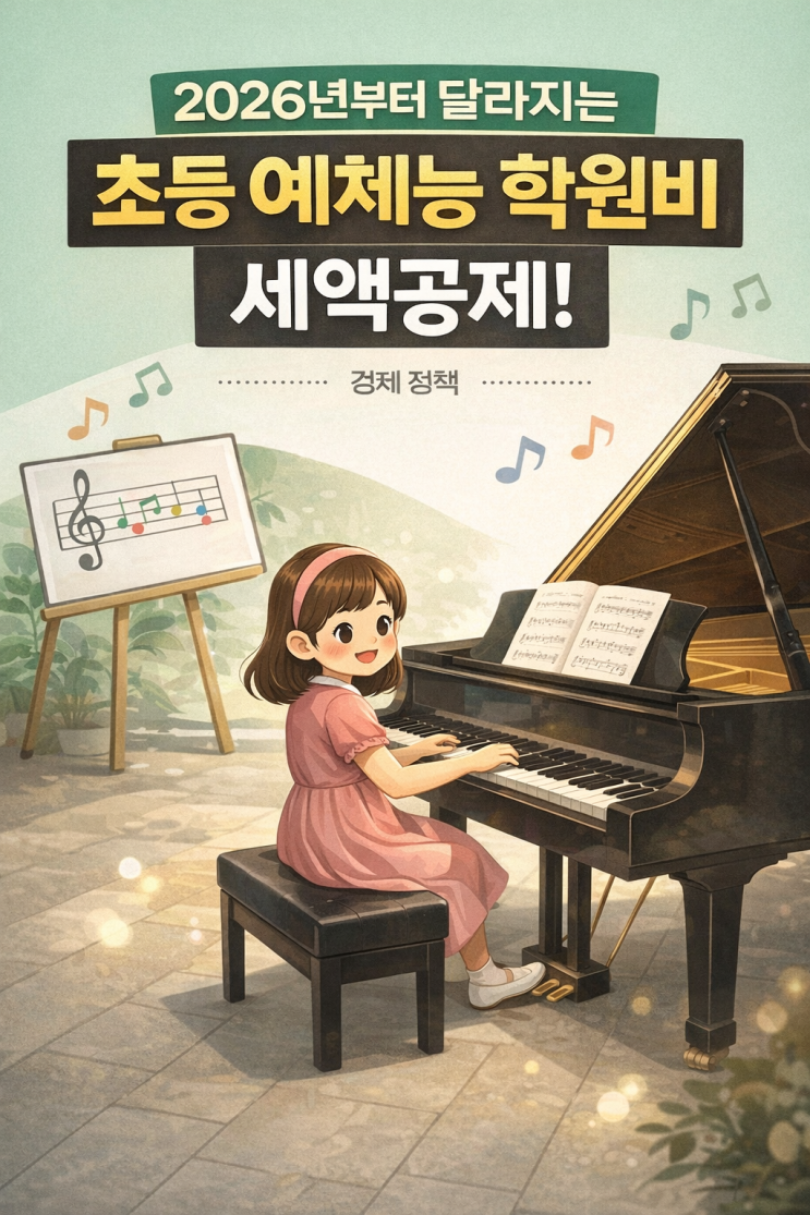 안녕하세요. 숙명더피아노 원장입니다. 2026년 새해부터 기쁜 소식이 있어 블로그에 정보 남겨드려요~ 그동안 초등아이들 사교육비에 아무래도 부담이 있었는데, 예체능 교육은 연 300만원까지 세액 공제가 된다는 사실 알고 계셨나요~?^^ 미리 숙지 하셔서, 올해엔 정부 세액공제까지 야무지게 챙겨보시길 바라는 마음에서 이번 포스팅을 제작했습니다. 정보가 도움 되시길 바래요^^ ✅ 2026년부터 바뀌는 학원비 세액공제 핵심 ✔ 적용 시기: 2026년 1월 1일 이후 지출한 학원비부터 적용 (2027년 연말정산에서 반영) ✔ 공제율: 지출금액의 15% 세액공제 ✔ 공제 대상: 초등학교 1~2학년(만 9세 미만) 자녀의 예체능 학원비 포함 태권도, 미술....... <img src="https://blogthumb.pstatic.net/MjAyNjAxMTRfOTEg/MDAxNzY4MzUxNzgwMjEw.DylAqgtWPjyjvcYRVwz6GeTQ3XY0gBqmmlwFai41e4Mg.rkxHax5viqjybSn5JwWXGSLj0DMpn72_3ZWxDmzEFBQg.PNG/KakaoTalk_Photo_2026-01-14-09-34-22.png?type=s3" />