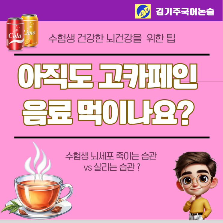 안녕하세요! 수능 국어의 길잡이, [김기주 국어(주클래스)]입니다. 중간고사, 기말고사 그리고 대망의 수능까지. 우리 아이들은 1년 내내 시험의 굴레 속에서 엄청난 양의 텍스트와 씨름합니다. 특히 국어 비문학 지문은 고도의 사고력을 요구하기에 뇌 에너지 소모가 엄청나죠. 그런데 아이들이 잠을 쫓기 위해 습관적으로 마시는 에너지 드링크와 고카페인 커피, 이게 과연 공부에 도움이 될까요? 오늘 제가 그 위험성과 함께, 전교 1등의 맑은 머리를 만드는 비결을 공개합니다. 1. 뇌세포를 죽이는 습관 "가짜 집중력의 치명적인 대가" 수험생들이 에너지 음료를 찾는 이유는 단 하나, '각성 효과' 때문입니다. 하지만 이....... <img src="https://blogthumb.pstatic.net/MjAyNjAxMTlfMTA3/MDAxNzY4Nzg5NDcwNjgx.KdOGSShKYOcCvjvCYYHumqYDcOAqB_L9D1zZqP__gMUg.H5OnQgpg7B_xv9_7QjpSUq3kwoy8TXhOimX9ROt5xRUg.PNG/%C6%C4%B6%F5%BB%F6%B0%FA_%C8%B8%BB%F6_%BD%C9%C7%C3%C7%CF%B0%ED_%B1%F2%B2%FB%C7%D1_%BA%F1%C1%EE%B4%CF%BD%BA_%C4%AB%B5%E5%B4%BA%BD%BA_%C0%DB%BC%BA_%BF%E4%B7%C9_%BE%C8%B3%BB_%B5%F0%C0%DA%C0%CE_%C5%DB%C7%C3%B8%B4_%C0%CE%BD%BA%C5%B8%B1%D7%B7%A5_%C6%F7%BD%BA%C6%AE%C0%C7_%BB%E7%BA%BB_%2848%29.png?type=s3" />