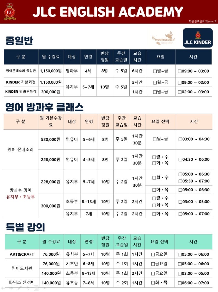 2026년 JLC ENGLISH ACADEMY 교육프로그램 및 원비 안내 *자세한 상담은 원으로 연락주시기 바랍니다. ☎02-571-2571 <img src="https://blogthumb.pstatic.net/MjAyNjAxMjBfNzIg/MDAxNzY4ODkyOTY4Mjk1.DVrU4zobfkRWSwzBrIaV0bZZ7rLedrW4G5ujb7YGF3kg.IOfgDNCzpW18rCfRCyWHcEgmn46Ier1SUA7H1P6ZR3wg.JPEG/JLC교육_프로그램(26.01).jpg?type=s3" />