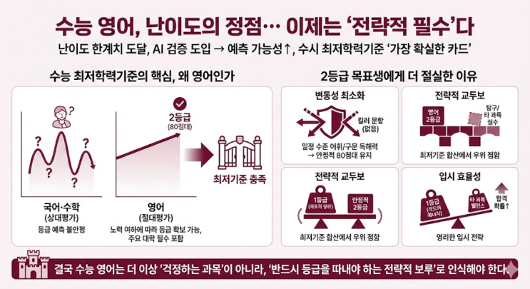 숭실고, 수능 영어 이제는 '전략적 필수' 최근 수능 영어는 난이도 조절의 한계치에 도달했다는 분석이다. 한국교육과정평가원(KICE)이 도입하는 AI 검증 시스템 등을 고려할 때, 난이도가 여기서 더 극단적으로 높아지기는 어렵다. 변동성이 줄어들고 예측 가능성이 높아진 지금, 수능 영어는 수시 최저학력기준 충족을 위한 '가장 확실한 카드'가 되었다. 숭실고, 수능 최저학력기준의 핵심, 왜 영어인가 수시 전형에서 수능 최저기준을 맞춰야 하는 숭실고 학생들에게 영어는 선택이 아닌 필수 조건이다. 국어와 수학이 상대평가로 운영되어 등급 예측이 불안정한 반면, 영어는 절대평가 체제이기 때문이다. 본인의 노력....... <img src="https://blogthumb.pstatic.net/MjAyNjAyMThfNjMg/MDAxNzcxNDAwOTc4NTQ3.L40mgT3m_4I13Q4Ki5eE59u5KLar8fzwIelzEeLpUu4g.lSg5c867ODxtWiYs03_2LOKRTg_tPbwTZKFgb1Nt_rYg.PNG/image.png?type=s3" />