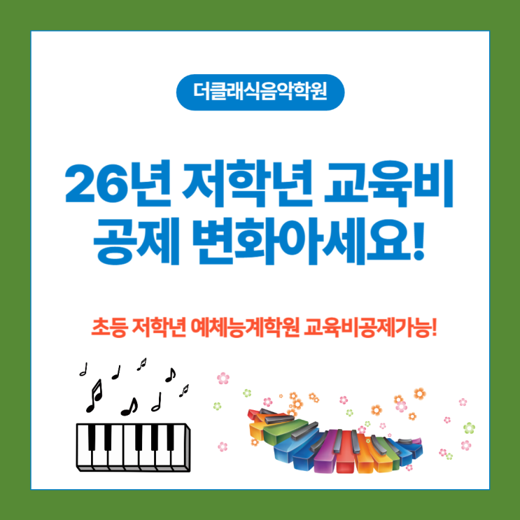 안녕하세요 양산 증산 음악학원 더클래식음악학원입니다! 25년이 끝나고 26년이 시작되면 연말정산 준비를 해야 합니다! 그래서 교육비 공제를 위해서 학원교육비 영수증을 원하시는 학부모님들이 많으십니다! 저희 음악학원의 경우는 유치부까지만 교육비공제가 가능합니다! 간혹,, 그 부분을 모르셔서 교육비 공제를 위한 영수증을 발급해달라고 하시는 학부모님들이 계신데 참조를 부탁드립니다! 그리고 올해부터는 학부모님들이 좋아하실 변화가 기다리고 있습니다! 올해 26년부터는 예체능계 학원에 한해서 초등 1,2학년까지는 교육비공제가 가능하도록 바뀌었습니다! 양산 증산 음악학원을 등록하실 초등부 1,2학년 학부모님들께서는 이점....... <img src="https://blogthumb.pstatic.net/MjAyNjAxMTNfMTcx/MDAxNzY4MjYyNDQwMzE2.U00MQ1g47Fv2lpJ8w_ThPOMlhw9pySY9YJYSYHQs0G8g.1pBw_h2R2sTPMW6ByYl54ykNhUr2qu_XzmQktAWzaZkg.PNG/%C1%A6%B8%F1%C0%BB_%C0%D4%B7%C2%C7%D8%C1%D6%BC%BC%BF%E4_-001_-_2026-01-13T090022.880.png?type=s3" />