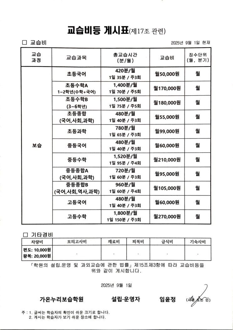 교습비게시표