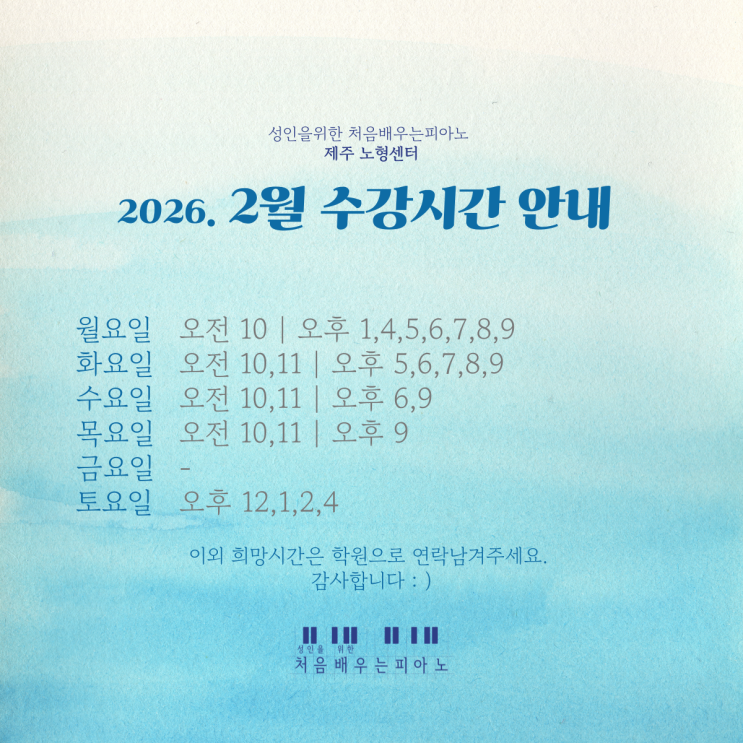 안녕하세요, 처음배우는피아노입니다 2026년 2월 수강 시간표를 안내드립니다. 현재 시간표는 기존 수강생 우선 배정을 기준으로 구성되었으며, 신규 수강 문의는 남아 있는 가능 시간에 한해 순차적으로 안내드리고 있습니다. 학원은 수강생님의 연령과 수준, 성향에 맞춘 1:1 맞춤 레슨을 기본으로 운영하고 있어 시간 조정에 다소 제한이 있는 점 양해 부탁드립니다. 수강 시간 관련 문의나 조정이 필요한 경우 편하게 연락 주세요 2월에도 여러분의 음악적 성장을 정성껏 함께하겠습니다. 감사합니다 ! ! : ) — 처음배우는피아노드림 <img src="https://blogthumb.pstatic.net/MjAyNjAxMjhfMjc4/MDAxNzY5NTk1MzUyODgx.3IlhDq45UK3yaFrhrA5LAnJCJvj_ZW9shmuGan4wmW0g.LEGS7sQ-uVJUc_JrokTpjxCGeMU1Pc9aXMbbaSBQybIg.PNG/002.png?type=s3" />