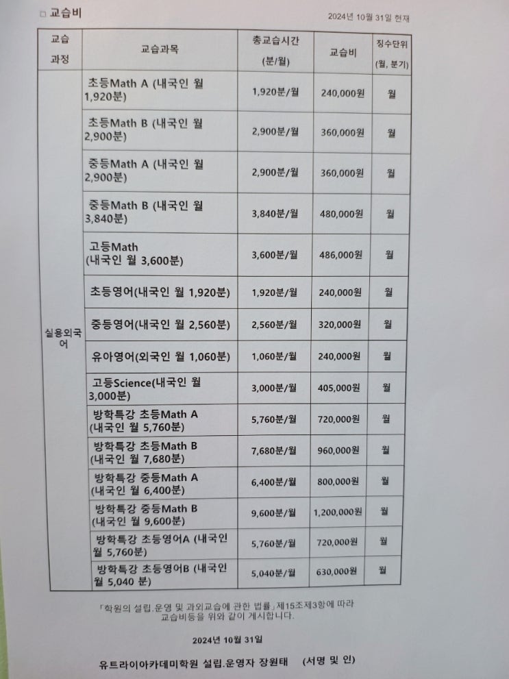 유트라이아카데미학원 교습비