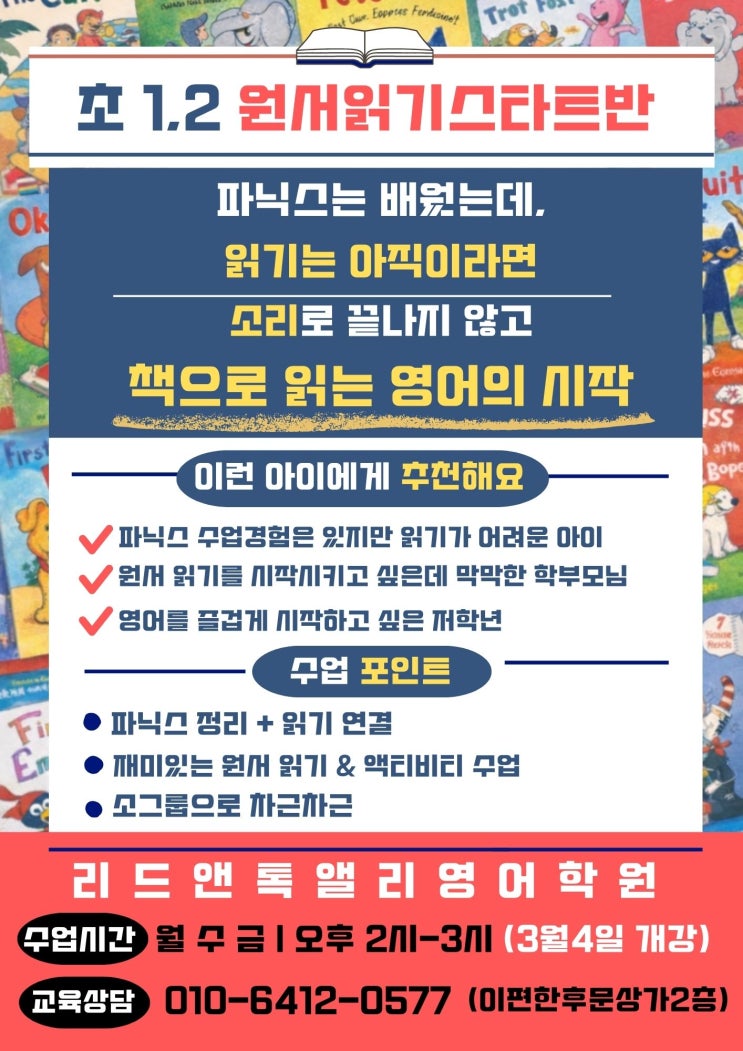안녕하세요, 리드앤톡 앨리영어 앨리T 예요. 오늘은 저학년 친구들과 학부모님들께 반가운 소식을 가져왔어요. 바로 저학년(초 1, 2학년) 원서읽기 스타트반 개강!! 입니다. 초1–2 파닉스는 했는데, 읽기가 안 된다면? “알파벳도 알고, 파닉스도 배웠는데 아직 제대로 읽기 못하는거 같아요." "이제 원서를 좀 읽히고 싶은데 집에서 어떻게 지도해야 할지 막막해요.” "막상 영어책을 펼치면 아이가 멈춰요." 상담을 하다 보면 초1–2 학부모님들께서 가장 많이 하시는 말입니다. ✔ 소리는 아는데 ✔ 단어를 이어서 못 읽고 ✔ 영어책을 보면 부담부터 느끼는 단계 이 시기에 ‘다시 파닉스만 반복’하는 것보다 중....... <img src="https://blogthumb.pstatic.net/MjAyNjAxMjRfNDkg/MDAxNzY5MjU4MjM3MzEw.-FK80dxB3CiDJ86z3QziBA3zFzIGoeauu2tqDBji65Ug.y8GyDTZ7GuOVUHIqzDssa7TZTh_irs0xyOctn00tZ1Yg.JPEG/Book_Review_Worksheet.jpg?type=s3" />