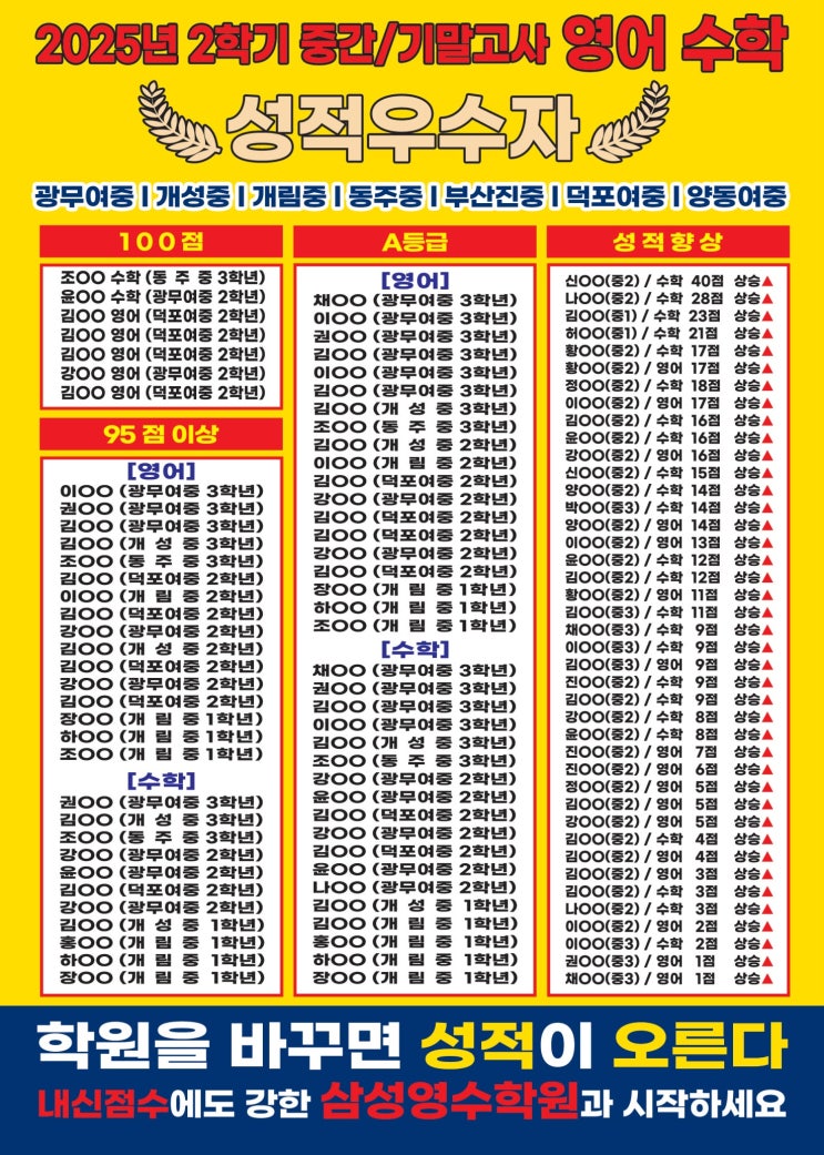 2025년 2학기 중등부 결과로 증명한 ESM삼성영수학원 안녕하십니까? 아이들의 영어 수학 실력향상을 최우선으로 생각하는 개금 영어학원, 개금 수학학원 ESM삼성영수학원입니다~! 2025년 2학기 중간고사와 기말고사가 모두 마무리되면서, 광무여중, 개성중, 개림중, 동주중, 덕포여중, 부산진중, 양동여중에 재학 중인 우리 중등부 재원생들의 성적 결과를 취합해 보았습니다~! 이번 학기 역시 우리학생들 100점, A등급을 비롯해 눈에 띄는 성적향상 사례들이 다수 나왔습니다 ^^ 모두모두 너무 축하합니다~! 이 모든 결과는 성실하고 착한 우리 학생들이 다년간 성적으로 입증한 우리학원 내신대비 프로그램을 잘 따라와준 덕분입니다. 매일 타....... <img src="https://blogthumb.pstatic.net/MjAyNjAxMDVfMTg0/MDAxNzY3NjA0MjIwMjc2.7mQcqKQ_RXW4MpX3sGQpIw2pYmkuzmQEBdOJ8bYgYuEg.QXJehqfLoPCPLs_eSbM7d6zsUPpIuzvxk7fqFqMKB8Yg.JPEG/KakaoTalk_20251226_131928956.jpg?type=s3" />
