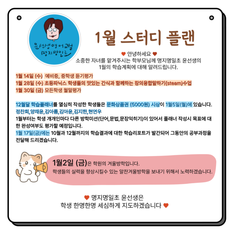 명일초영어 윤선생 명지명일초의 1월 스터디플랜